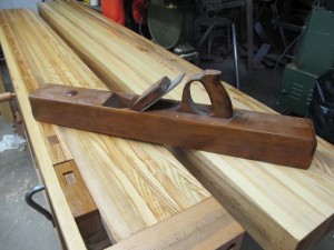 The sole of the jointer plane is flat, wide and long. My No 7 jointer is 22″ long and 3″ wide really heavy, but with continual use you do get used to its weight. I have an even bigger wooden jointer that’s 26″ and heavy! Unlike the Jack plane, the iron of the jointer is honed square, although I tend to ’round’ off the edges of mine so as not to leave cut marks on the surface of board –